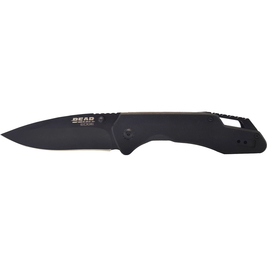 This Bear Edge 61502 G10 Assisted Drop Point Sideliner Folding Knife from Bear & Son features a reversible pocket clip for carrying convenience. This folding pocket knife includes a 3-3/8 in. 440 stainless-steel drop point blade with a handle made of black G10. The folding utility knife has assisted opening and sideliner lock for easy use. Open length measures 7-7/8 in. and closed length measures 4-1/2 in, Folding pocket knife weighs 4.4 oz. Imported. Folding knife with taper ground blade for durability. Model: 61502.