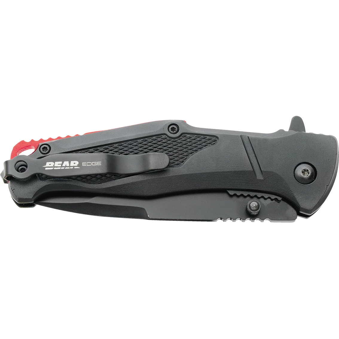 The Bear Edge Pattern 121 from Bear & Son is a USA built 4-7/8 in. Black & Red Assisted Sideliner. The Hollow Ground 3-3/8 in. Tanto Blade is made from 440 Stainless Steel with a Black Powder Coating Finish to prevent rusting. The spring assistance along with pushing up on the Thumb Studs allow for a smooth and quick opening of the Bear Edge Logo engraved blade. To make opening even easier, Pattern 121 also features a Blade Trigger that allows for a fast action opening. The Bear Edge Pattern 121 features a Sideliner Lock that ensures the blade will remain firmly in place once opened and is easy to close. Jimping is present on the top of the blade and handle for a more secure grip. The Black & Red Aluminum Handle features a Bear Edge engraved Reversible Pocket/Boot Clip for Tip-Up Carry and quick access for either the left- or right-hand carry. A Glass Breaker is also on the back of the blade for use in emergency situations and a lanyard hole is present for secure fastening and storage. The Bear Edge Pattern 121 weighs 3.9 oz. and is proudly built in the USA. Model: 61121.