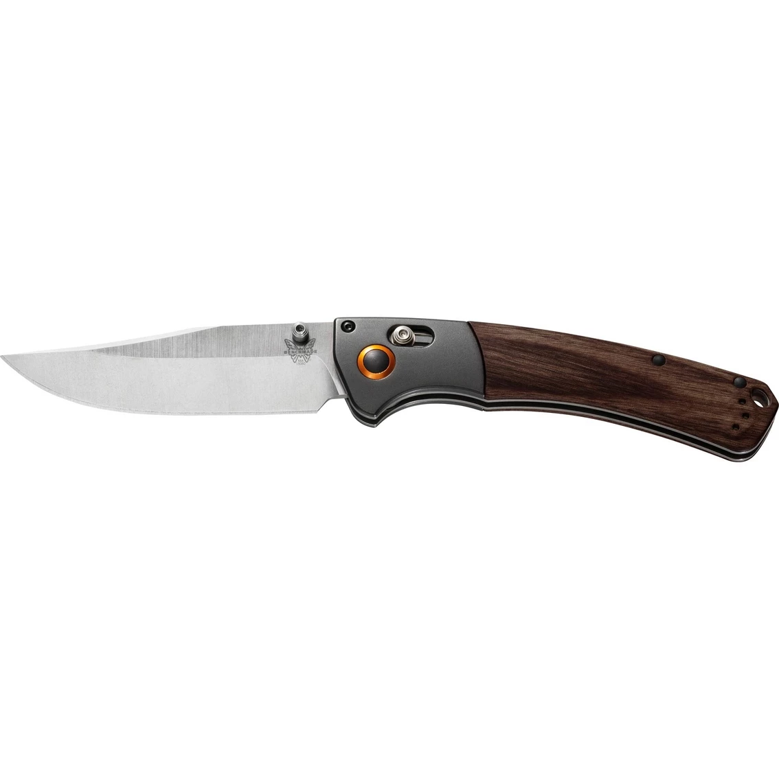 The traditional shape of the Benchmade Crooked River, combined with modern technology, pushes the preconceived notions of what a hunting knife should be. Crooked River includes a wood handle. Made in USA.