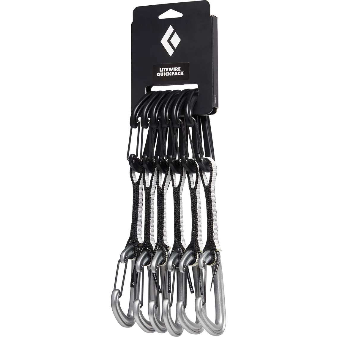 A six pack of Black Diamond Equipment LiteWire draws, featuring their new LiteWire wiregate, a small, durable workhorse carabiner featuring a lightweight hot-forged construction and a 12cm long, 12mm Dynex dogbone. The LiteWire Draw is light enough to save weight on big routes, but burly enough to withstand every day abuse.