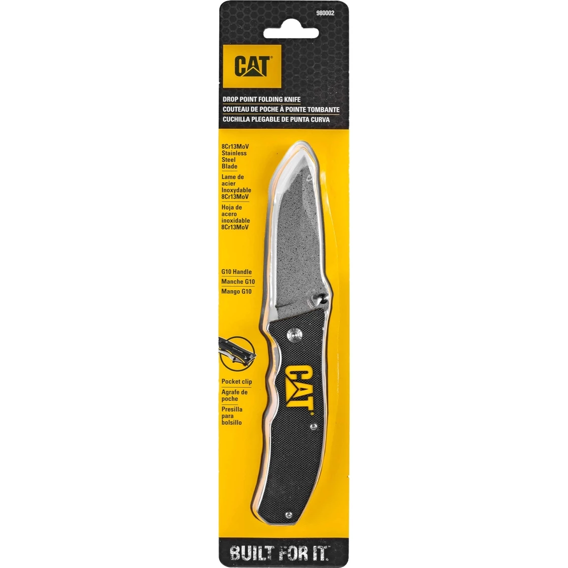 CAT 980002 7.5 in. Drop Point Folding Knife. Big tough cutting jobs call for a bigger blade. Here’s your answer: a stiff and burly EDC folder with a generous 3.125 in. blade that offers strength and sharpness to spare. A textured G-10 handle offers plenty of grip with finger grooves and guard. The handle is fastened to a stainless steel frame and mated with a tough drop-point 8Cr13MoV stainless steel blade with a stonewash finish. You’ll reach for this handy folder for big jobs and bigger adventures. Model: 980002.