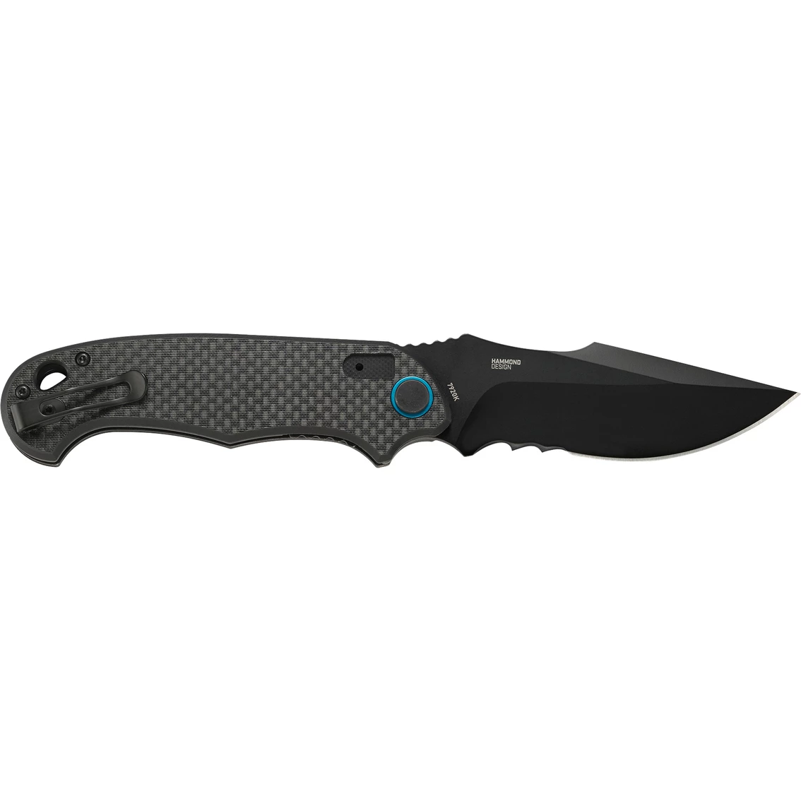 When designer Jim Hammond of Birmingham, Alabama put pen to paper, he did so with the intention of creating a knife that was equal parts powerful, compact, and highly aesthetic. The P.S.D. hits the mark. The impossible-to-miss re-curve of the blade performs when making deep cuts and slicing, the Veff Serrations breezes through rope and cord, while the double grind makes pushing more efficient. The surprisingly compact G10 and carbon fiber handle accommodates a solid four-finger grip and is finished with an electric blue pivot and pocket clip.