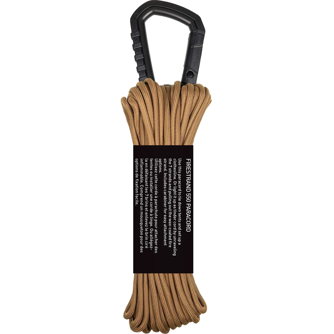 Gear Aid’s Fire Strand 550 Paracord is a 50 Ft 100% nylon paracord in coyote and rustproof Carabiner. This strong 7-strand cord is for adventures big and small. It is ready to handle simple, yet critical jobs including hanging clothes, tensioning tarps and making a shoelace, or it doubles as a flammable “paratinder” cord for starting a fire. This lightweight 50-ft. long cord also includes a sturdy carabiner that can withstand the elements and conveniently attaches to rucksacks, MOLLE systems and more. Seven inner strands can be unraveled and pulled out to reveal the wax-coated fire strand for sparking campfires, using as a fishing line, thread, trip wire, etc.