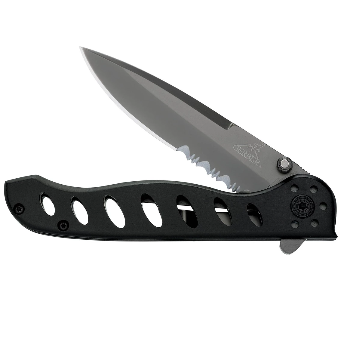 The EVO is a lightweight, straight-spined clip folder. Designed with a series of seven slanting oval openings in the anodized aluminum handle, it’s one of the lightest folding knives that Gerber makes. Ther serrated blade is constructed of 440 stainless seel and is coasted iwht a titanium nitride for added corrosion resistance. There is a thumb stud for easy one-handed opening, and a liner lock and finger guard for an extra measure of safety. It’s a modern version of a traditional straight spine knife.