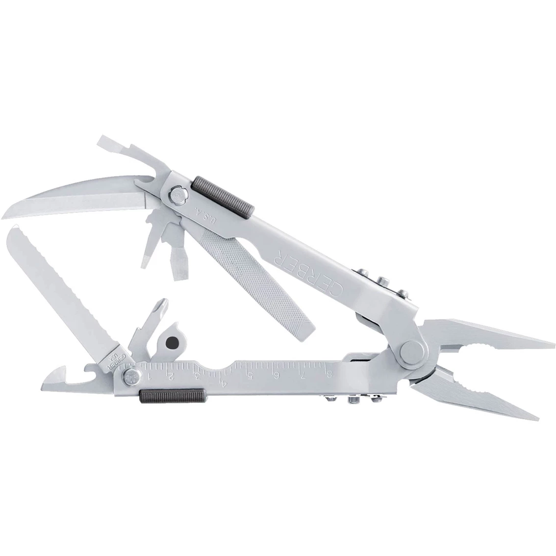 Includes: Needlenose pliers, replaceable carbide cutters, fine edge knife, serrated knife, small, medium and large flathead screwdrivers, cross point screwdriver, bottle and can opener, file, ruler. Comes with ballistic nylon sheath.