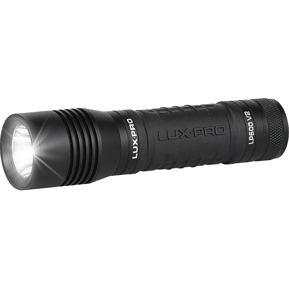 LUX PRO LP600V3 is a High-Output Small Handheld light is a durable waterproof aluminum LED 550 Flashlight. It has 4-Modes, LPE Optics with a molded rubber grip. This LUX PRO Flashlight includes a wrist lanyard and 4 AAA batteries.