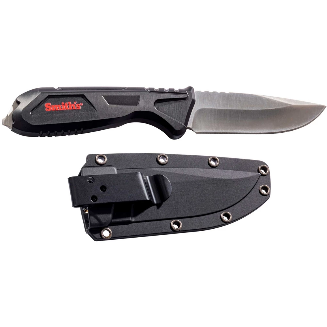 Smith’s EdgeWork-Site 4.0″ fixed blade features a black stonewash finish that provides extra protection while providing a rugged look. The razor-sharp fixed blade is made of precision heat treated 400 series stainless steel blade. The fixed blade knife is equipped with a glass-filled textured handle and hard sheath with an ambidextrous belt clip.